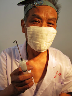 I pay 1RMB, for the priveledge of first being allowed to find the doctors office (which is no mean feat - even with a Chinese guide), find the doctor, and sit down for an examination. She listens to my chest, and sends me off to another room to have a blood test. The lady takes my blood, then we wait for about ten minutes while she examines it under the microscope. She writes her findings, then sends me back to the original doctor. The doctor checks it, then sends me up two flights of stairs to a different doctor (pictured above), who checks my throat, and decides I need special medicine. We go back downstairs to pay for the medicine, and return to his office. This is where it gets scary...